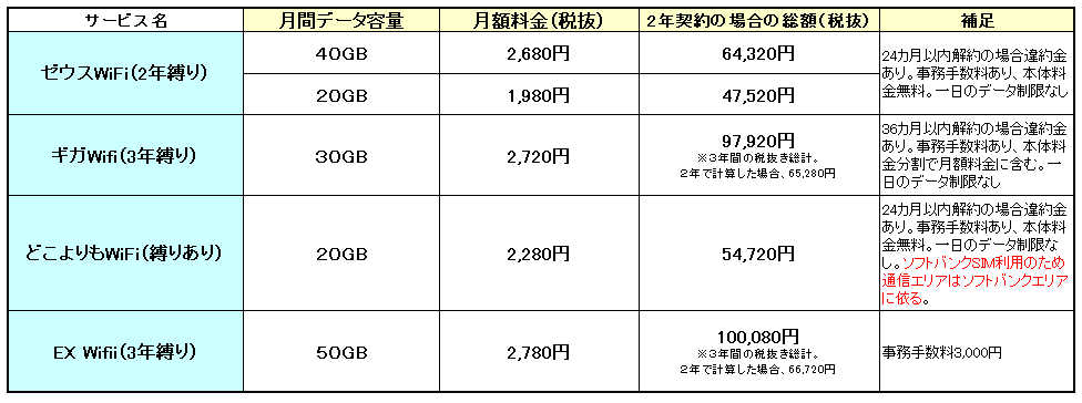 なかでもゼウスWifiは、20GB・40GBのいずれの場合も一番コスパのよい料金プランを展開しています。