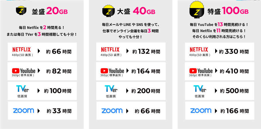 100GBほどの容量は必要ない場合、20GBと40GBから選ぶことになるでしょう。目安としては、リモートワークなどで家で日常的に通信環境を必要としている場合は40GB、夜間や休日などにネット通信を楽しむ場合は20GBなどで考えていけばよいかも知れません。
