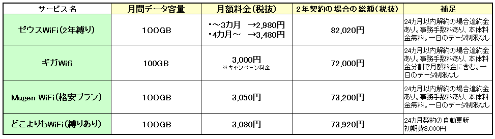 長く利用する場合は、一時的なキャンペーン価格やキャッシュバックより、総額でコスパのいいものを選びましょう。以上のサービスは税抜きで3,000円前後というかなりの格安での提供ですが、中でも「Mugen Wifi」「ギガWifi」が2年総額で72,000円ほどと、かなりのおすすめとなっています。