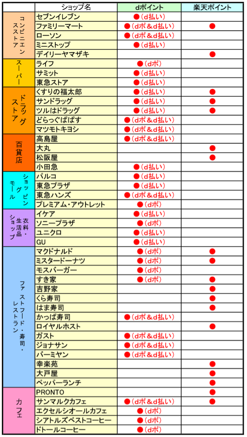 以下のリストは、日常的な生活必需品の買い物でdポイント、あるいは楽天ポイントが付く主な店をまとめたものです。
