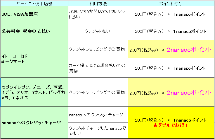 その他、 ビッグカメラやロフト、ココカラファイン、エネオスなど、1か月の利用分に対し、翌月にまとめてポイントが加算される店舗があります。 支払いにnanacoを利用できる店舗はどんどん増えています。住んでいる地域や会社・学校に利用できる店舗があるか、確認しておきましょう。