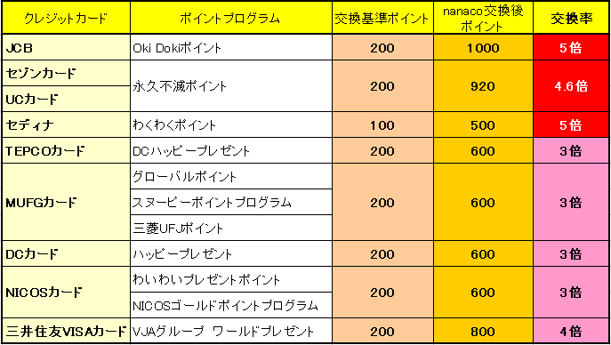 各クレジットカードのポイントプログラム でポイントを獲得し、ポイント数に応じてnanacoポイントに交換します。 nanacoポイントに交換できるクレジットカードは数ありますが、高い率で交換できるカードは以下の通りです。