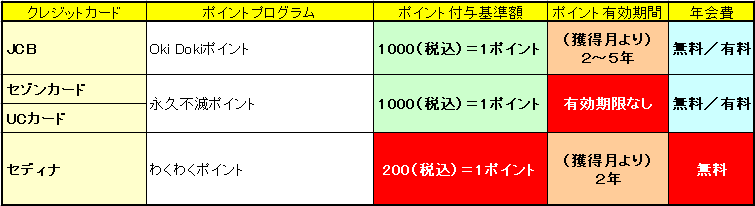 ポイントの貯めやすさはセディナが一番のようです。利用額200円(税込)ごとに1ポイントが貯まります。他の3社は1000円(税込)ごとなので、貯めやすさはピカ一ですね。また、年会費は無料なので維持費もかからず、付与されたポイント分無駄なく貯めることができます。他の3社については、カードの種類の豊富さゆえに、無料と有料のカードがあります。カードの維持費を重視する場合は無料のものを選びましょう。