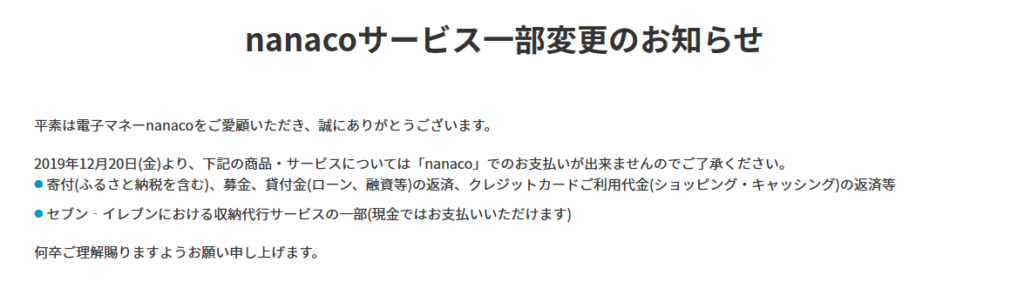 また、セブンイレブンでの収納代行サービスの一部もnanacoでできなくなるということも明記されています。税金支払いはまさしく収納代行サービスにあたるので、非常に気になる事案です。