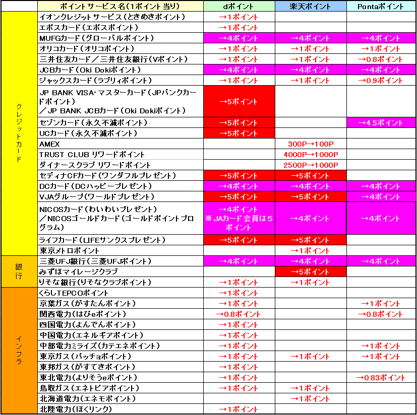 こうしてみると、多くのクレジットカードやインフラサービスでポイントが付くのが分かります。