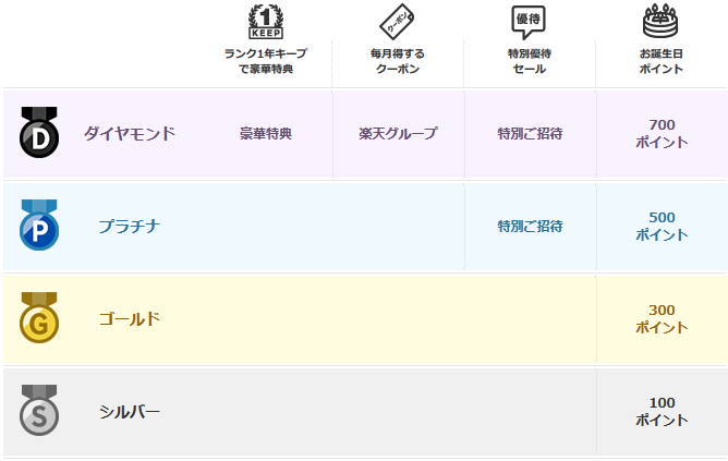 楽天ポイントクラブでは、ポイントの獲得数と獲得回数に応じて、レギュラー、シルバー、ゴールド、プラチナ、ダイヤモンドの5つの会員ランクを用意しています。ボーナスポイントだけではなく、それぞれにお得な限定特典もゲットできるので、ランクアップのモチベーションになりますね。