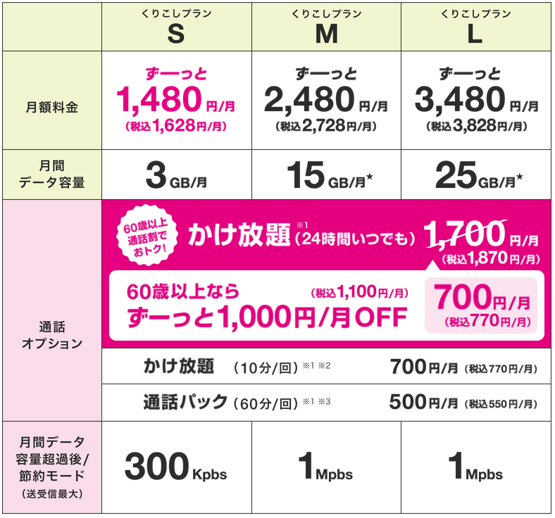 上記の表にあるように、月間データ容量3GBで税込み1,628円、通話オプションでは24時間かけ放題は60歳以上で税込み770円という破格の値段です。1,628+770=2,398円は税込みなので、これ以上のコストはかかりません。しかも永年なので特に問題なければこのまま放置してもいいくらいです。データ通信についても、youtube等で動画をたくさん視聴しなければ、ネット検索やLINE・メールなど特に不便なく利用できるのが3GB。家などでWifi機能が使えなくても、デフォルトで3GBがあれば全く問題ないといえます。