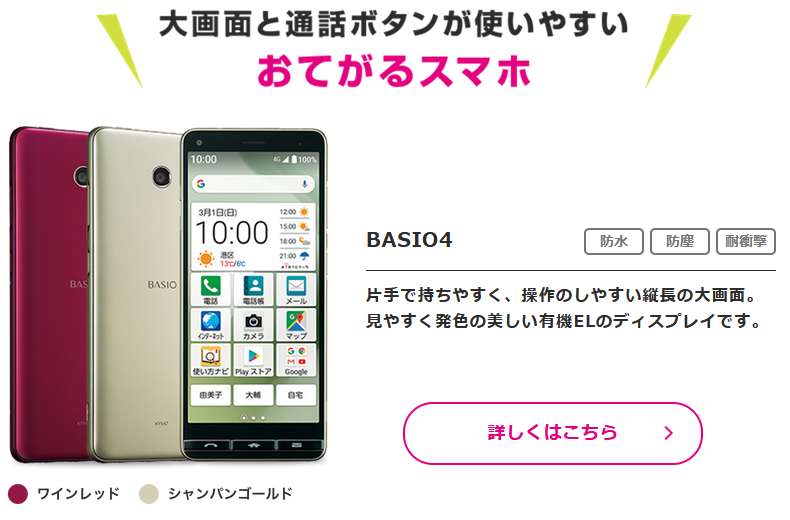 スマホ本体は、「おてがるスマホ」と呼ばれていたBASIO4が使いやすいでしょう。