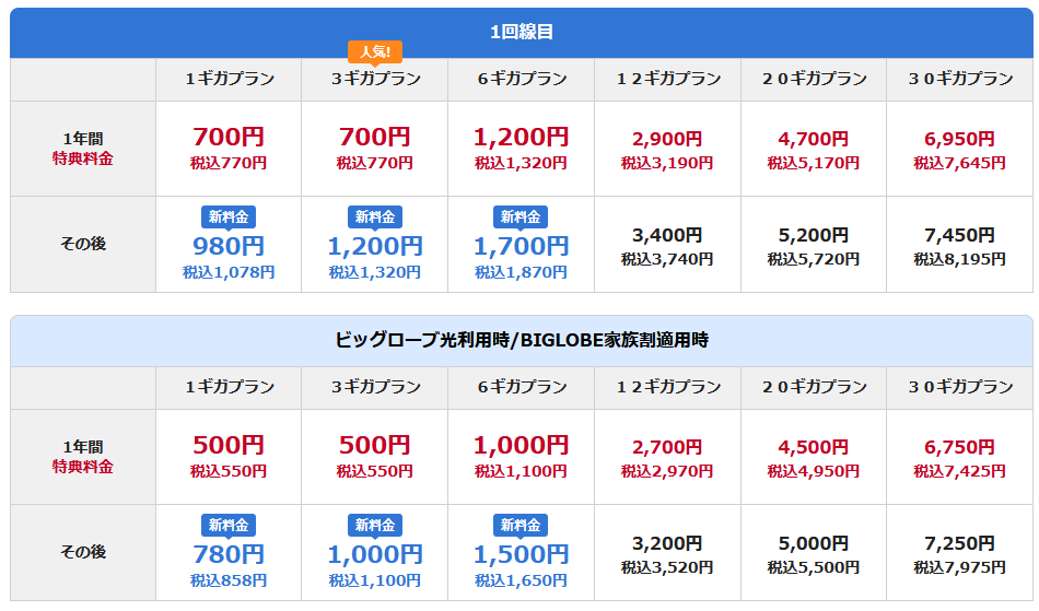 さらに、家族でBIGLOBEスマホや光を利用している場合は家族割が適用され、1GBプランは特典料金が適用される場合税込み550円と、以下の表のように更にお得になります!