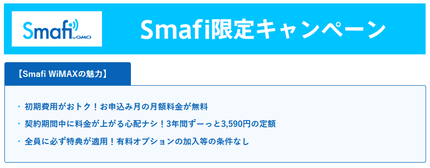 GMOとくとくBBが提供する情報発信メディア『Smafi』のリリース記念で2019年2月からサービスを開始した比較的新しいWiMAXキャンペーンです。 UQコミュニケーションズ株式会社と、KDDI株式会社のインターネット回線を使ったサービスで、 auやUQモバイルユーザーであれば月々の割引も適用されます。3年契約が必須ですが、3年間ずっと定額の3,590円(税抜)と分かりやすい料金設定で人気があります。
