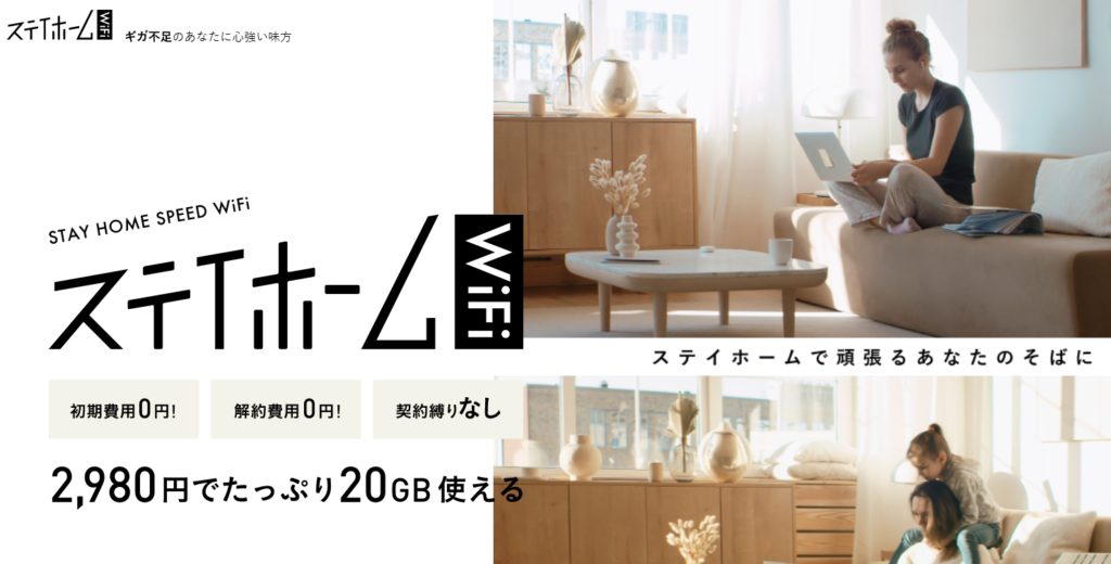 WiMAX2+プランというと「ギガ放題」と「7GB」プランの2選択が一般的です。ギガ放題まではいらないけど、7GBではちょっと心配…という場合におすすめのプランが「20GB」プラン。端末はWiMAX2+ではなくSpeed Wifiですが、「ステイホームWifi」というサービスが提供しています。